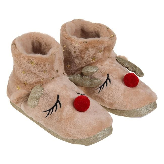 Дамските коледни пантофи – Елен с рога внасят истински празничен дух и топлина през зимните дни. Със своя нежен бежов цвят и очарователен дизайн на еленче, те са идеалното допълнение към коледното ви облекло у дома. 3D златисти рога, червен помпон като нос и златисти фолирани звездички придават забавен, празничен и уникален вид, който веднага привлича внимание.
