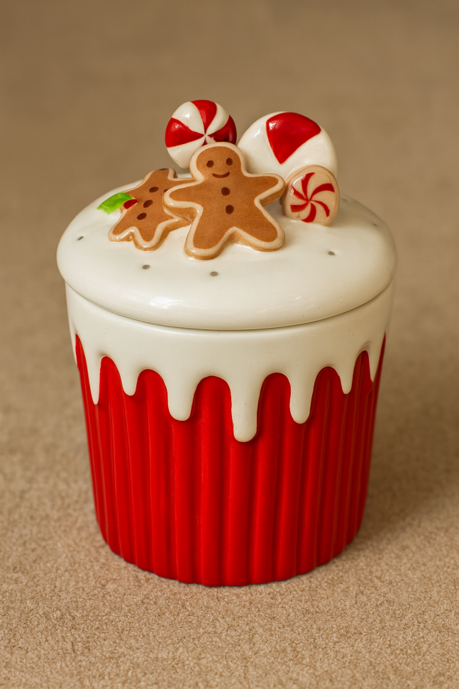 Коледната кутия за бисквити – керамична „Кексче“ е перфектното допълнение към празничния декор у дома. Изработена във формата на очарователно cupcake в червено, тя носи настроение, уют и коледен чар. „Снежният“ бял капак е украсен със сладки candy елементи и фигурки gingerbread, които придават уникална визия, сякаш кутията е излязла от истинска зимна приказка.