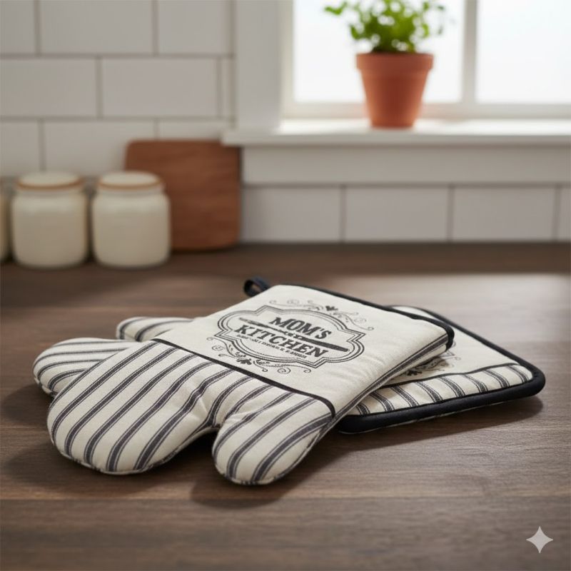 Добавете щипка семеен уют към интериора си с тази очарователна кухненска ръкавица с надпис и ръкохватка. Дизайнът в нежен цвят екрю и сиво, допълнен от симпатичната щампа „Mom's Kitchen“, превръща тези аксесоари в перфектния подарък за всяка майка, която готви с любов. Тези елементи не само красят помещението, но и внасят усещане за традиция и домашна топлина, правейки кулинарните моменти още по-специални.