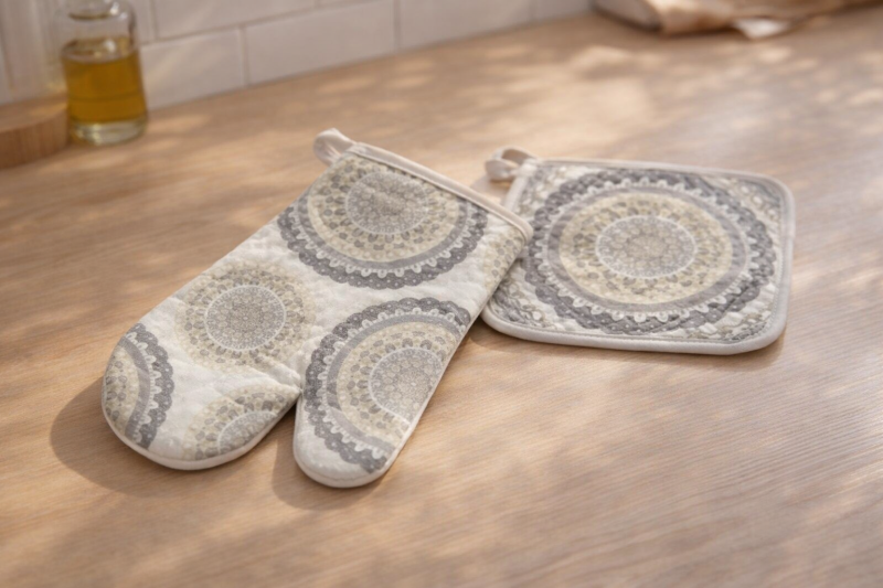 Добавете стил с тази кухненска ръкавица и ръкохватка с мандала дизайн. Висококачествена материя за надеждна защита и уютна атмосфера във всяка модерна кухня.