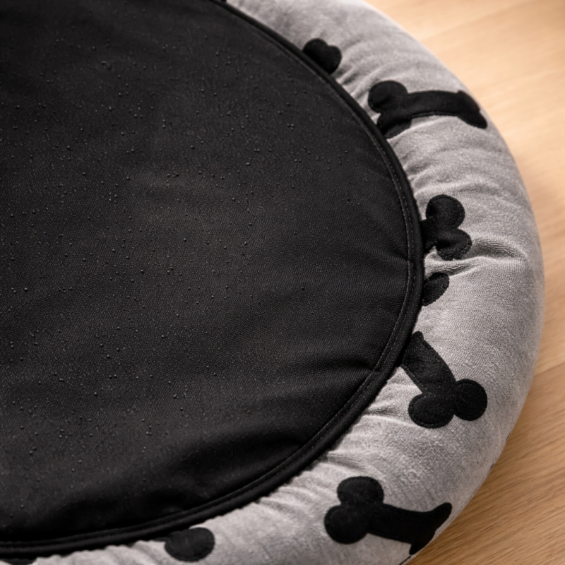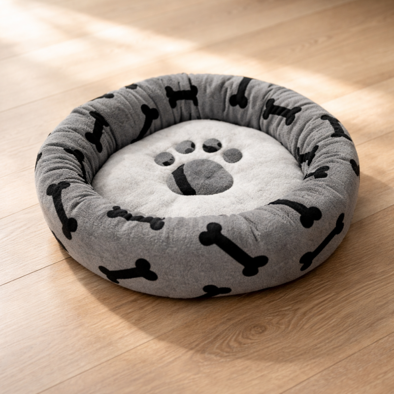 Леглото е изработено в сив цвят с десен на черни кокали и лапичка, който придава закачлив и модерен вид. Меката повърхност е приятна на допир и осигурява висок комфорт при лягане, като същевременно се вписва лесно в интериора на дома. Подходящо е за кучета, които обичат да се сгушват по време на сън.