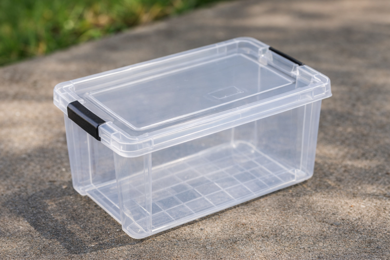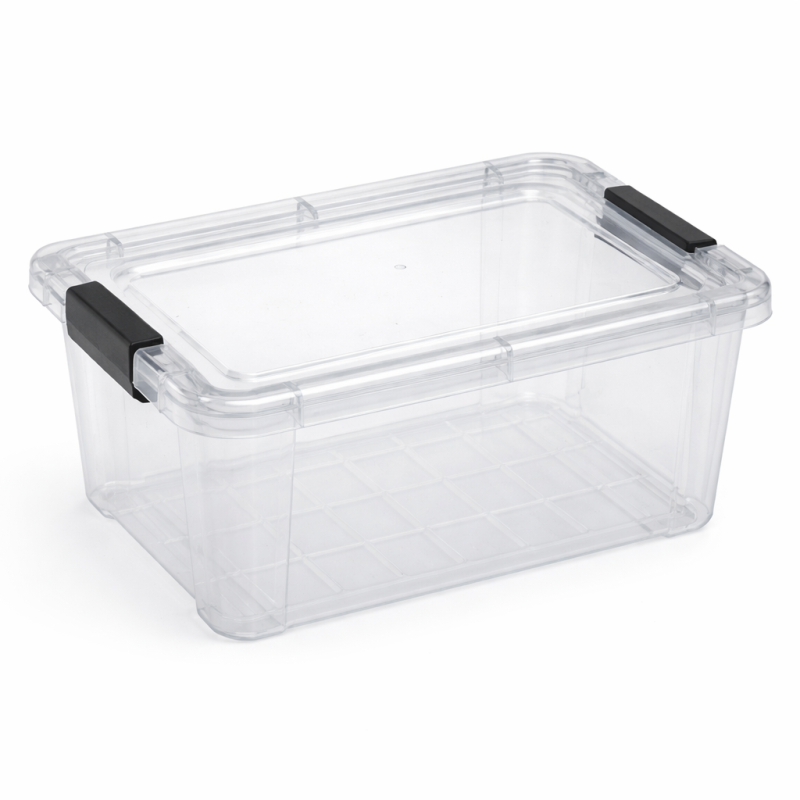 Изработена от здрава и устойчива пластмаса, тази пластмасова кутия за съхранение е предназначена за ежедневно използване. Прозрачният капак предпазва вещите от прах и влага, а сивите дръжки осигуряват стабилно затваряне и лесно пренасяне. Леката конструкция я прави удобна за местене и подреждане.