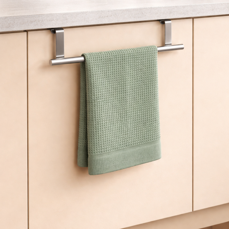 Тази закачалка за кърпи се закрепва директно на вратата на кухненски шкаф с дебелина до 2.3 см, без нужда от инструменти или пробиване. Може да бъде поставена както от вътрешната, така и от външната страна на шкафа, което я прави изключително гъвкава и удобна за различни пространства и нужди.