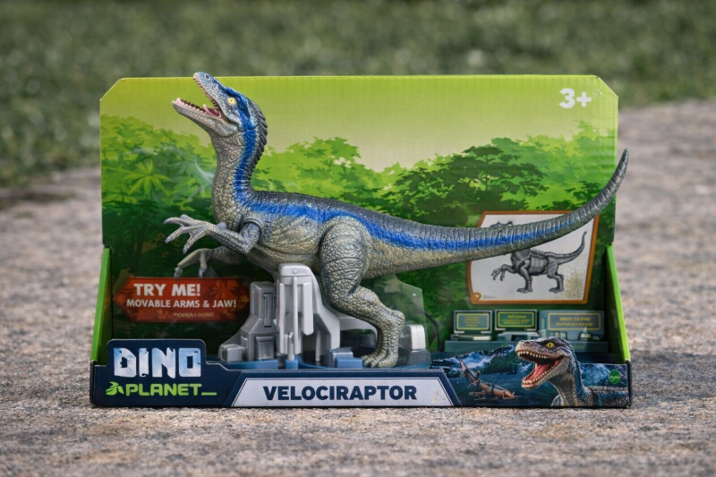 Динозавър със звук и светлини – Velociraptor – 34 см е интерактивна играчка с рев, светещ език и движещи се уста и опашка – идеален подарък за малките фенове на динозаври.