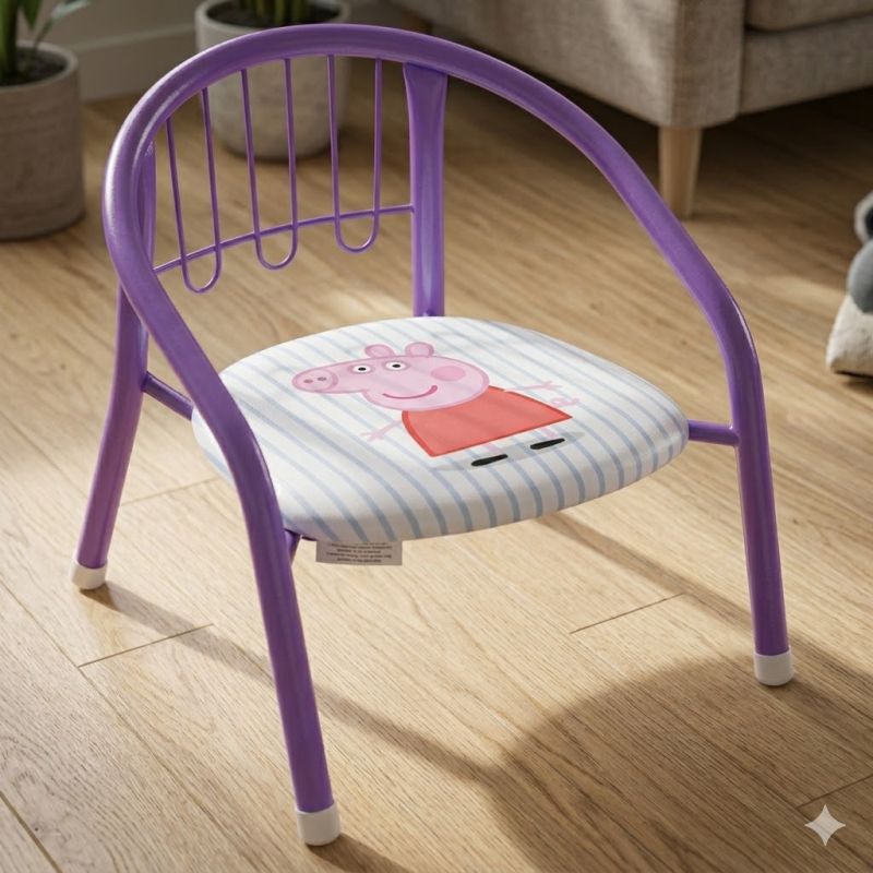 Детско столче Peppa Pig – стабилно метално столче в лилав цвят с весел дизайн. Осигурява комфорт и безопасност при игра, хранене и учене. Подходящо за детска стая и ежедневна употреба.