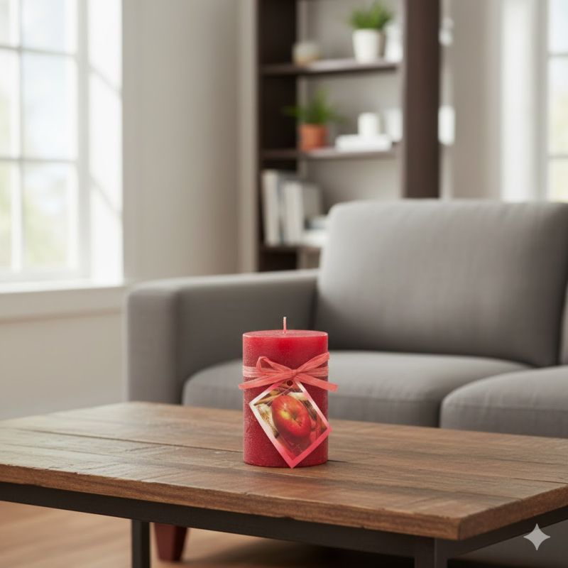 Ароматна свещ в червен цвят с аромат на ябълка и канела.