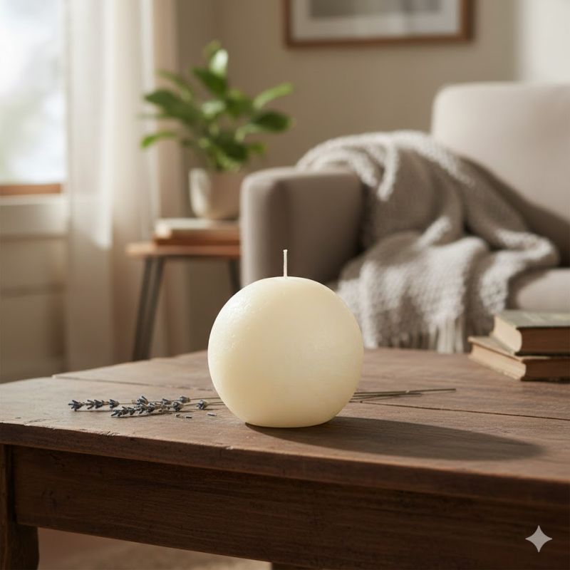 Ароматна свещ в цвят слонова кост във формата на топка с аромат на ванилия.