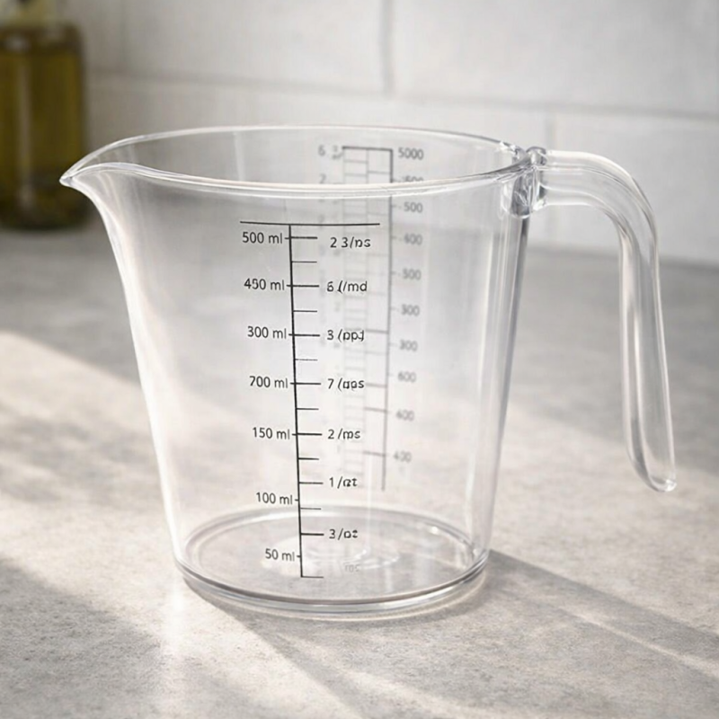 Пластмасова мерителна кана - мензура в зелен цвят с удобна дръжка и с фабрични количествени означения за грис и захар в грамове и за течности в милилитри.