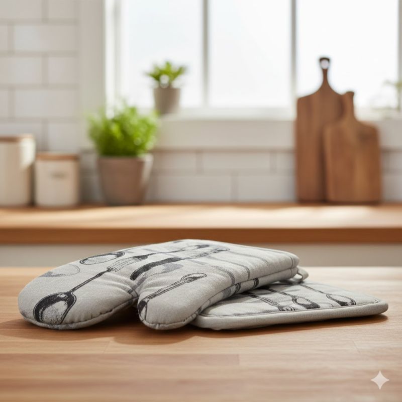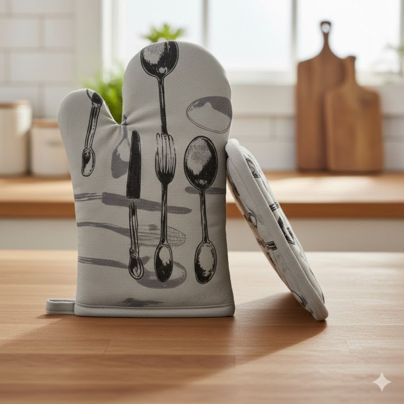 Кухненски комплект от топлоизолационна ръкавица и ръкохватка за горещи съдове, изработени от висококачествен памук в цвят екрю с тематична щампа на прибори за хранене.
